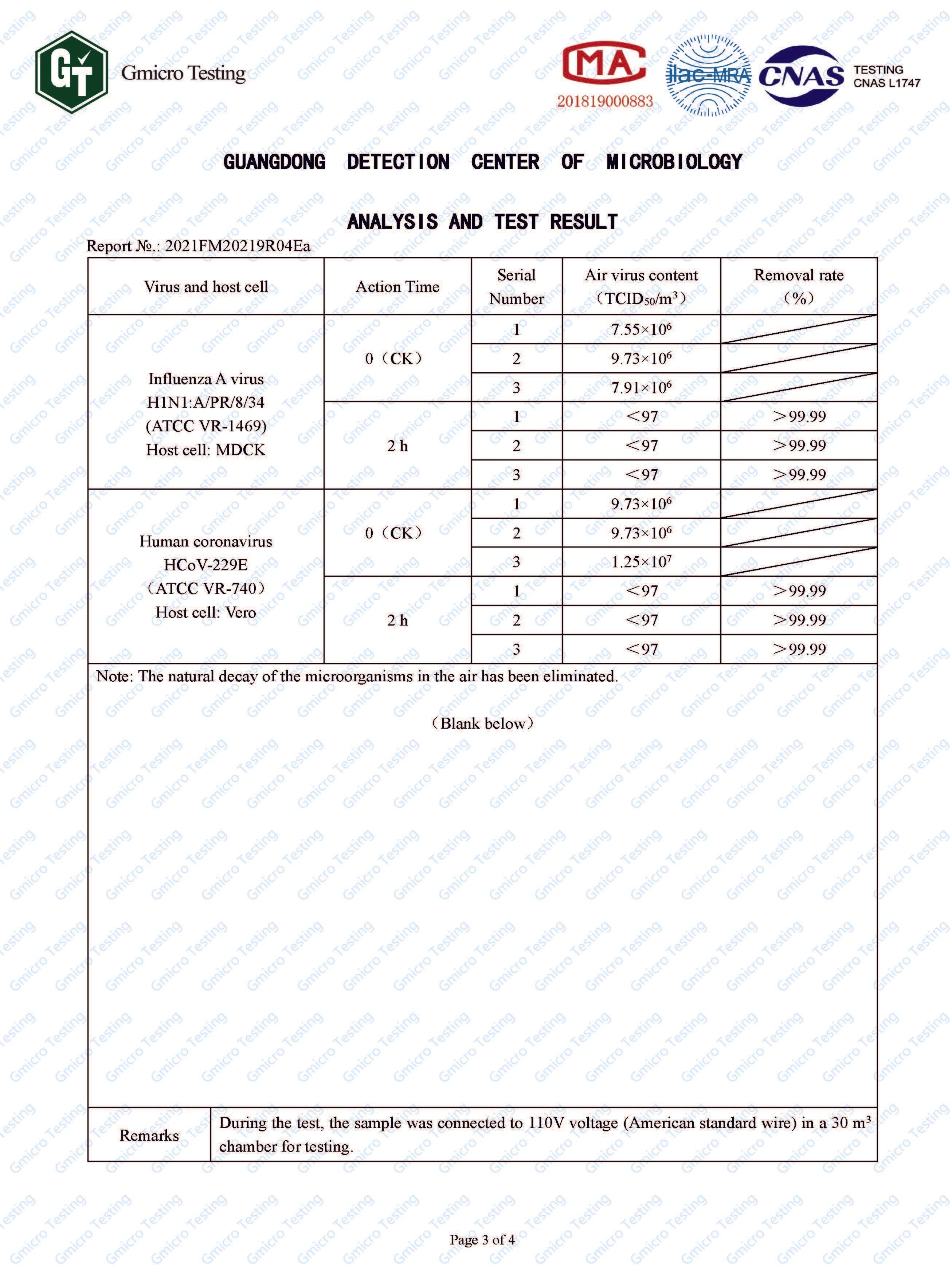 This model of New Comfort Ozone Generator demonstrated, through independent laboratory testing, to be effective at removing 99.99% of Viruses, 99.98% of Symbiont Bacteria, and 99.96% of Black Mold Spores in the air.  Test results showed reduction of 99.99% of airborne Human CoronaVirus 229E, 99.99% of airborne Influenza A H1N1 Virus, 99.96% of airborne Aspergillus Niger (Black Mold), and 99.98% of airborne Staphylococcus Albus (bacteria).  This independent test was performed in a 1,059 cubic feet lab test chamber for 2 hours.