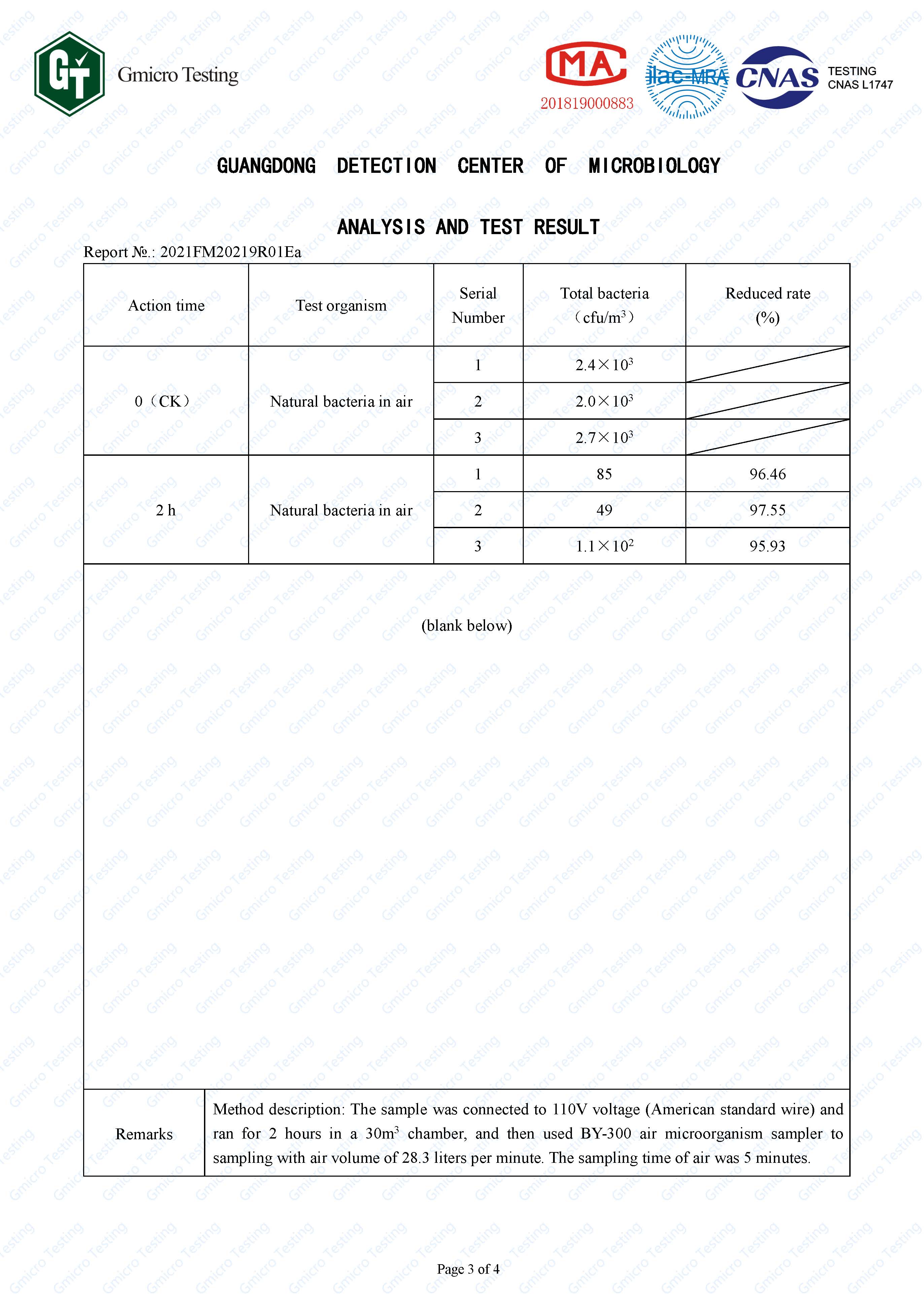 This model of New Comfort Ozone Generator demonstrated, through independent laboratory testing, to be effective at removing 99.99% of Viruses, 99.98% of Symbiont Bacteria, and 99.96% of Black Mold Spores in the air.  Test results showed reduction of 99.99% of airborne Human CoronaVirus 229E, 99.99% of airborne Influenza A H1N1 Virus, 99.96% of airborne Aspergillus Niger (Black Mold), and 99.98% of airborne Staphylococcus Albus (bacteria).  This independent test was performed in a 1,059 cubic feet lab test chamber for 2 hours.”