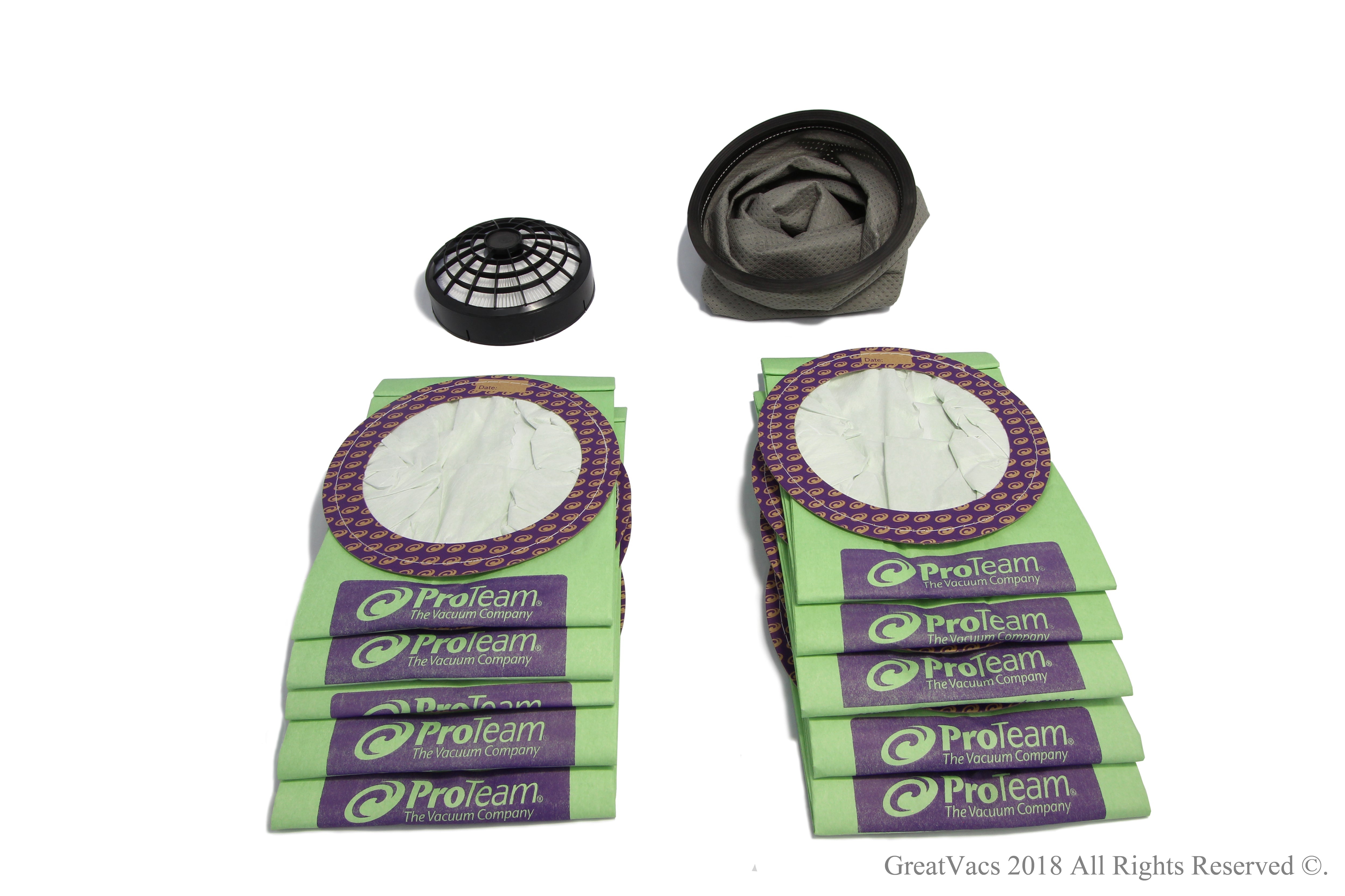 New Proteam MegaVac Maintenance Pack.This maintenance pack includes 20 Genuine Bags for the MegaVac (The bags are Disposable and designed to keep dust and allergens inside of your vacuum.). 1 Micron Cloth filter (The cloth filter is reusable and washable, the Micron also helps collect airborne particles and helps improve air quality as well.) and 1 round Hepa filter (HEPA filtration is 99.98% effective at keeping dust and allergens out of the air. This filters down to .3 microns and is washable.).