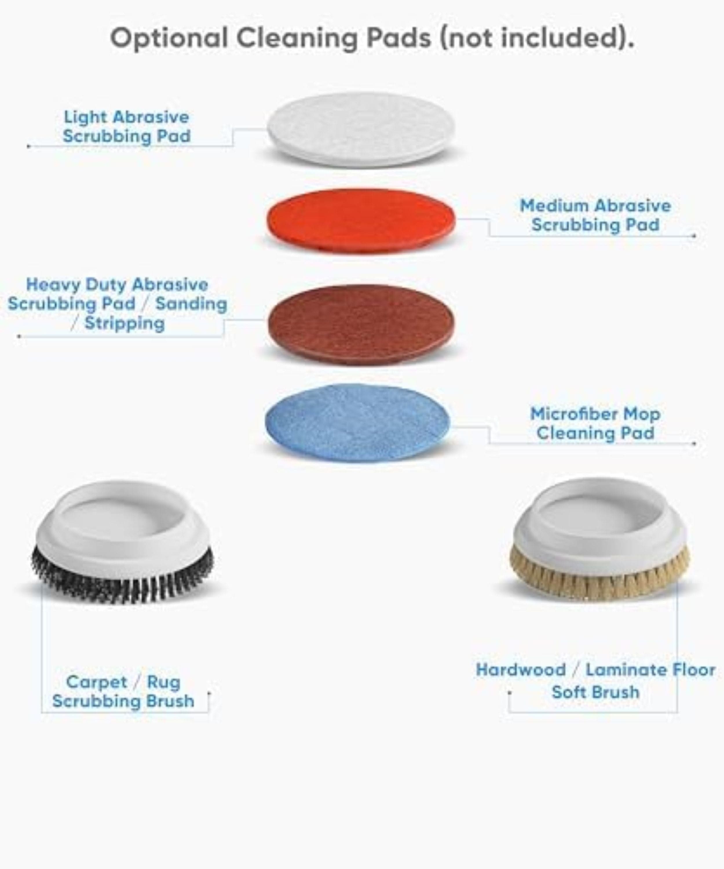 • VERSATILE - Many options available for multiple types of flooring. From hard surfaces like tile and concrete. To delicate surfaces like laminate, hardwood, gym floors & carpet, choose between different bristled brushes, different textured pads or microfiber cloths.  We have them all! (SOLD SEPARATELY).