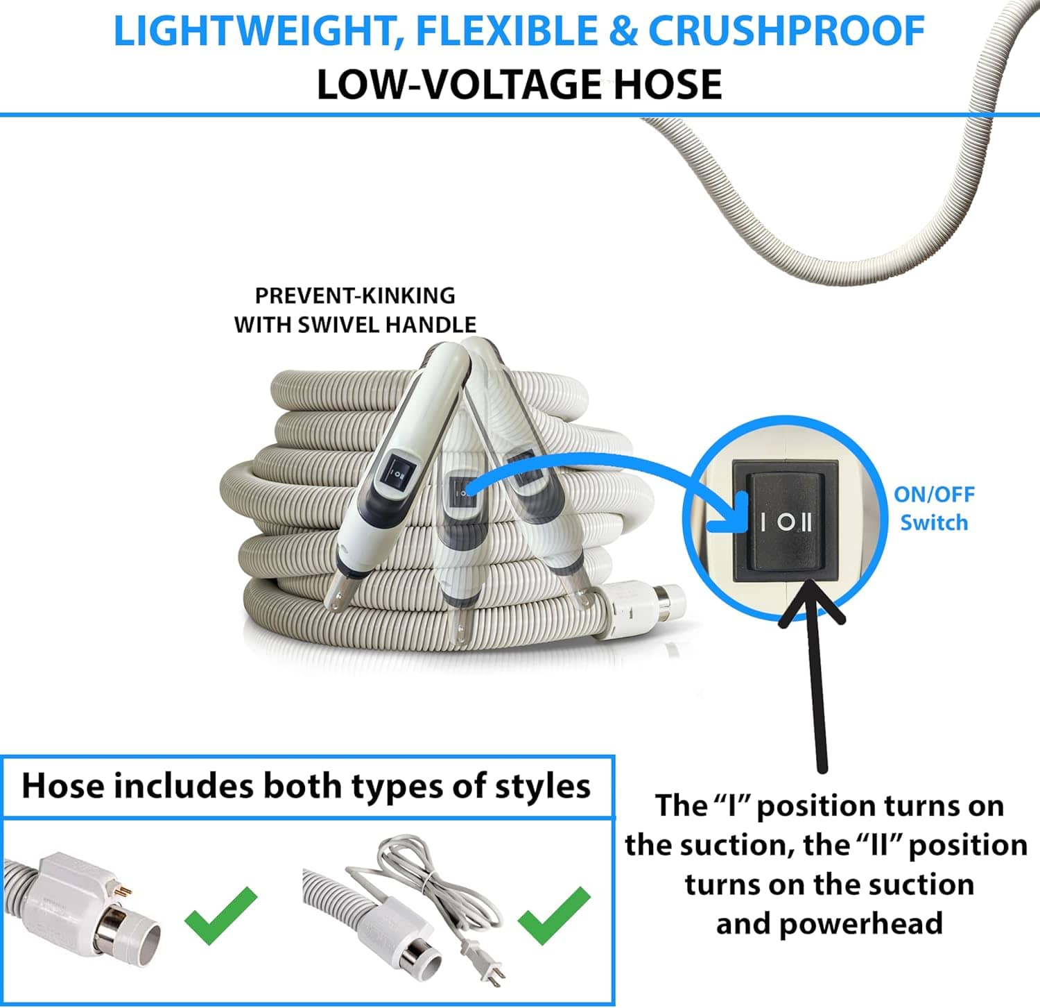 - POWER NOZZLE HOSE KIT: Comes complete with the central vacuum unit, and 30 foot hose tool and power nozzle hose kit. It is a common practice today for home builders to add the central vacuum piping to the home but that is it. Then all you have to do is attach the central vacuum unit and plug in your power nozzle hose kit. This has both of those so if your home already has the tubing installed this is all you need.