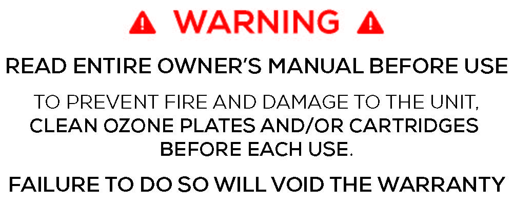 **WARNING** - Read entire owners manual before use. To prevent fire and damage to the unit, clean ozone plates and/or cartridges before each use. Failure to do so will void the warranty.