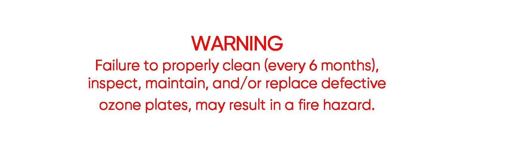 **WARNING** - Failure to properly clean (every 6 months), inspect, maintain, and/or replace defective ozone plates, may result in a fire hazard.