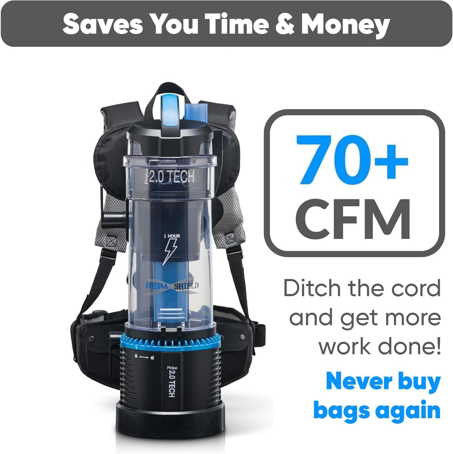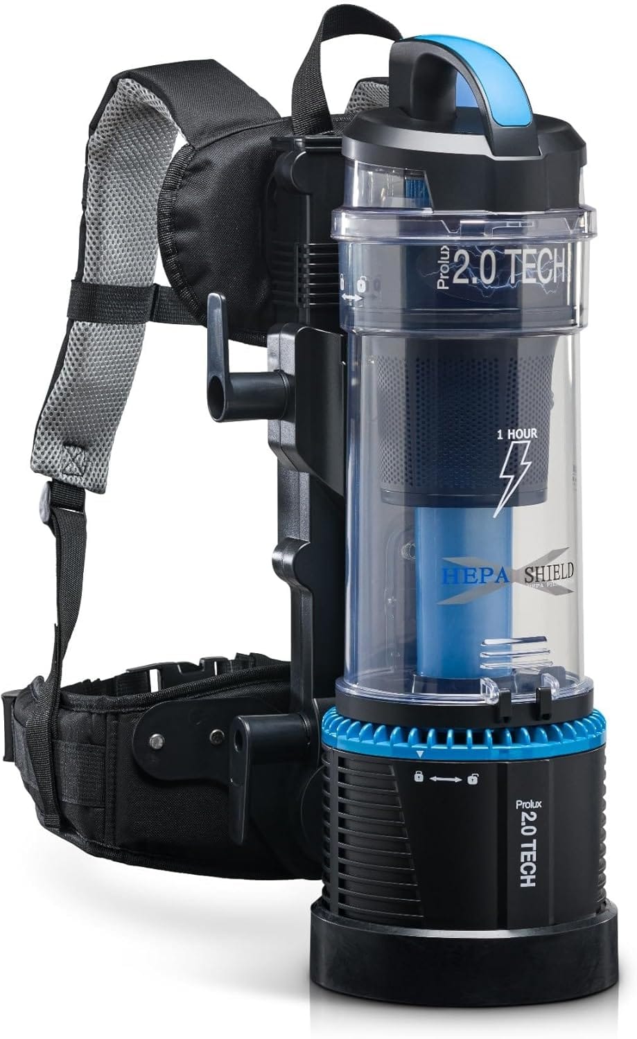 - Prolux 2.0 Cordless Bagless Upright Backpack Vacuum with 1 hour Lithium Ion Battery