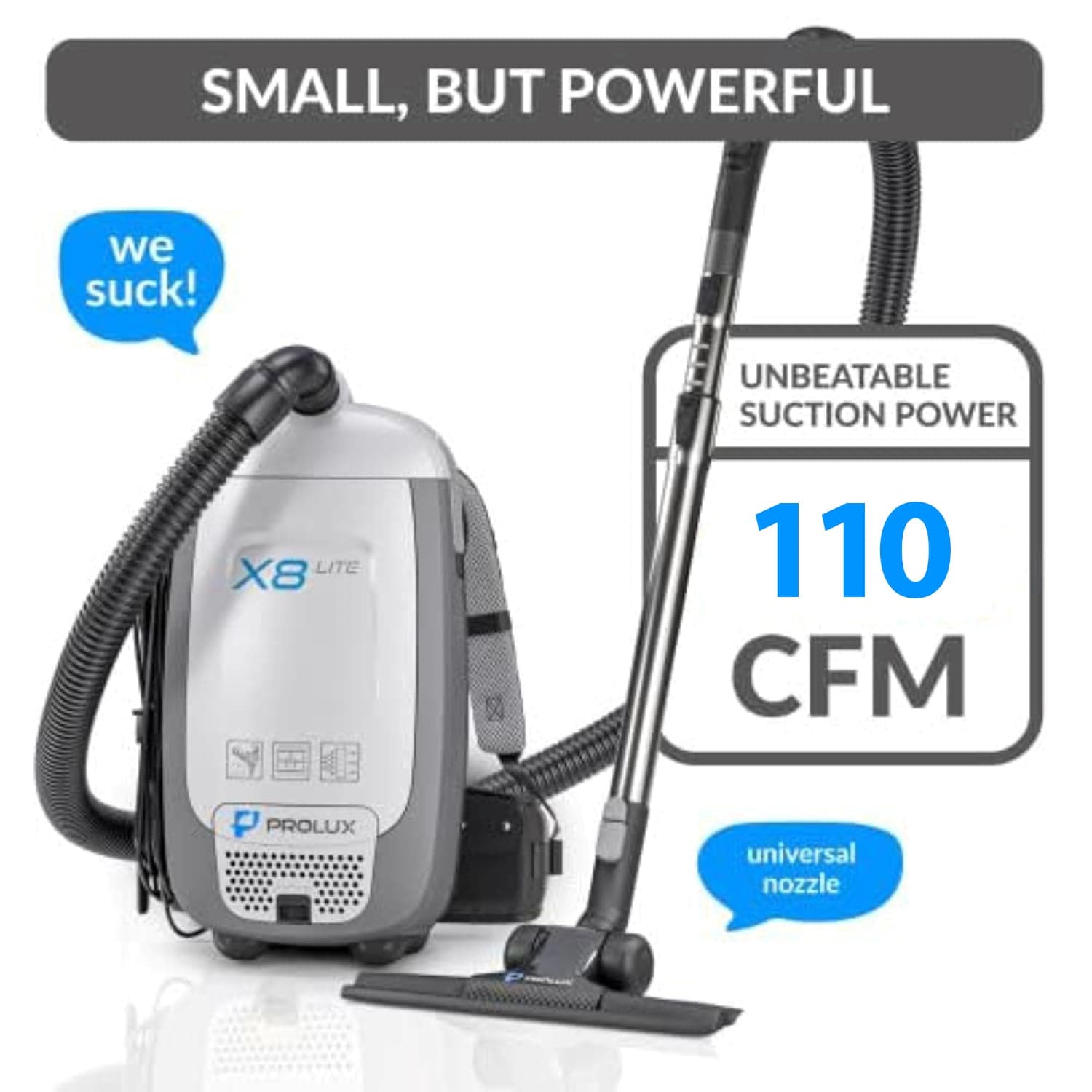 LIGHTWEIGHT & POWERFUL: Weighing just 10 pounds, the Prolux X8 Lite combines mobility with powerful 110 CFM suction, making it perfect for quick, efficient cleaning in residential settings.
