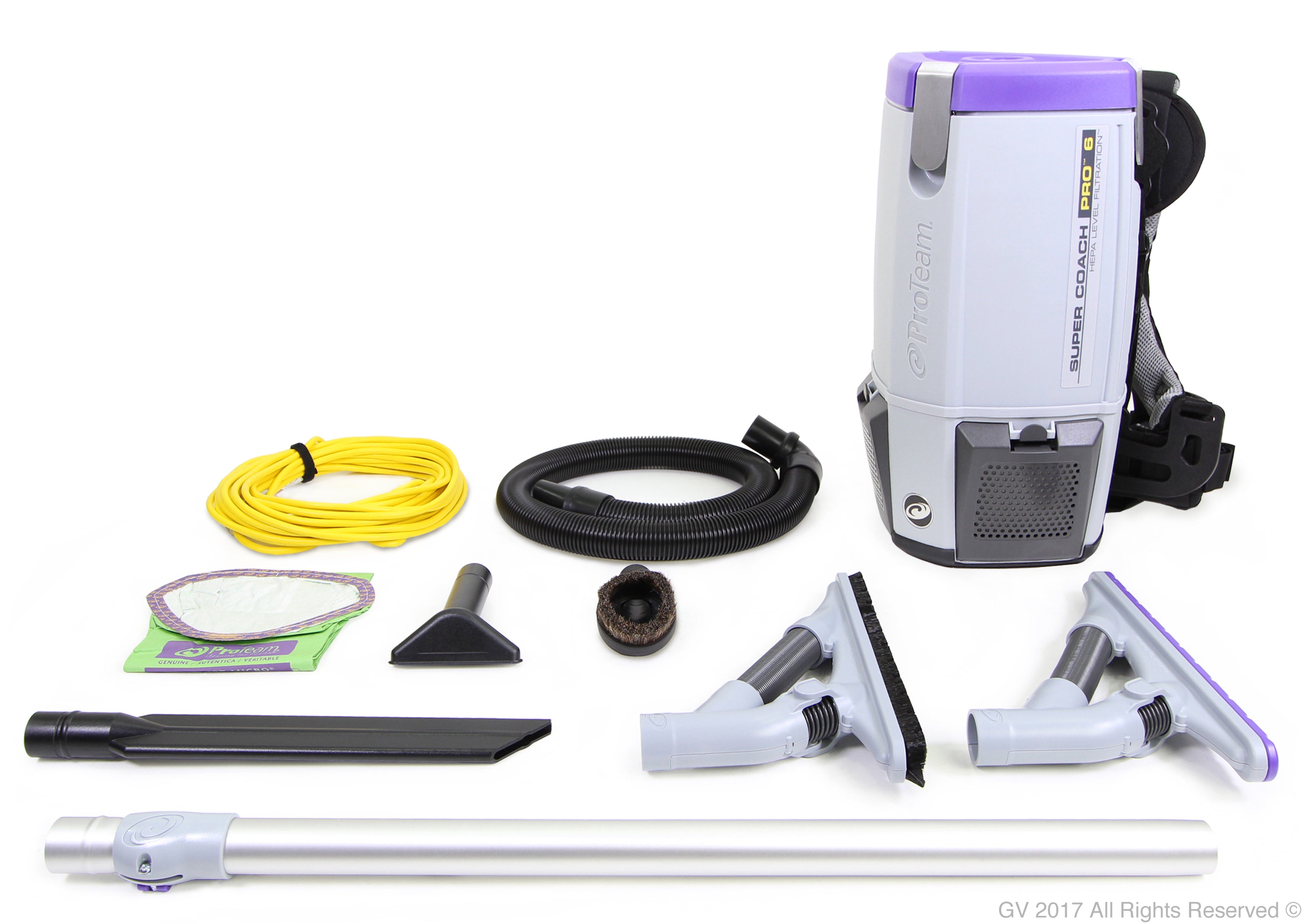 ProTeam Super CoachVac Pro 6 QT backpack vacuum with the Heavy Duty ProTeam 1 1/2" ProBlade attachment set, which includes: ProBlade carpet tool, ProBlade hard floor tool, Duster brush, Crevice tool, Upholstery tool, straight telescopic wand, heavy duty tool hose, and a 50' cord! The Super Coach Vac Pro 6 QT comes with a 5 year motor warranty and a Lifetime body warranty!