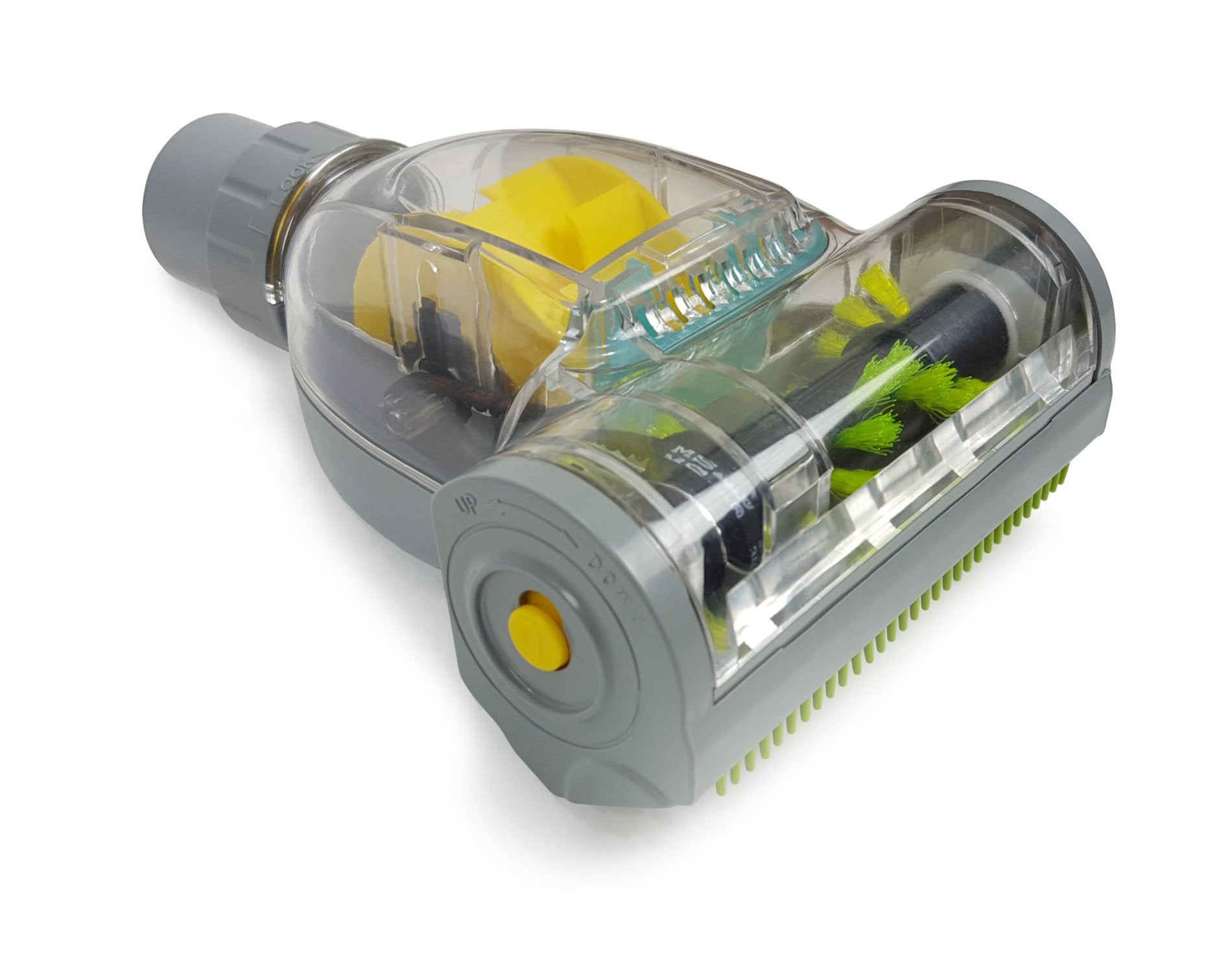 GV Deluxe Pet Tool Mini Head with brush roll that fits all standard vacuum cleaners including Kirby. This is the best pet hair tool in the business! Perfect tool for upholstery, stairs, and hard to reach places. This is the deluxe model with a geared belt which reduces slippage and increases the life of your tool. The brush roll is designed to sweep debris to the middle of the head for easy pick up. The swiveling bottom plate allows you to use this on your floors as well. Fits nearly any standard vacuum.