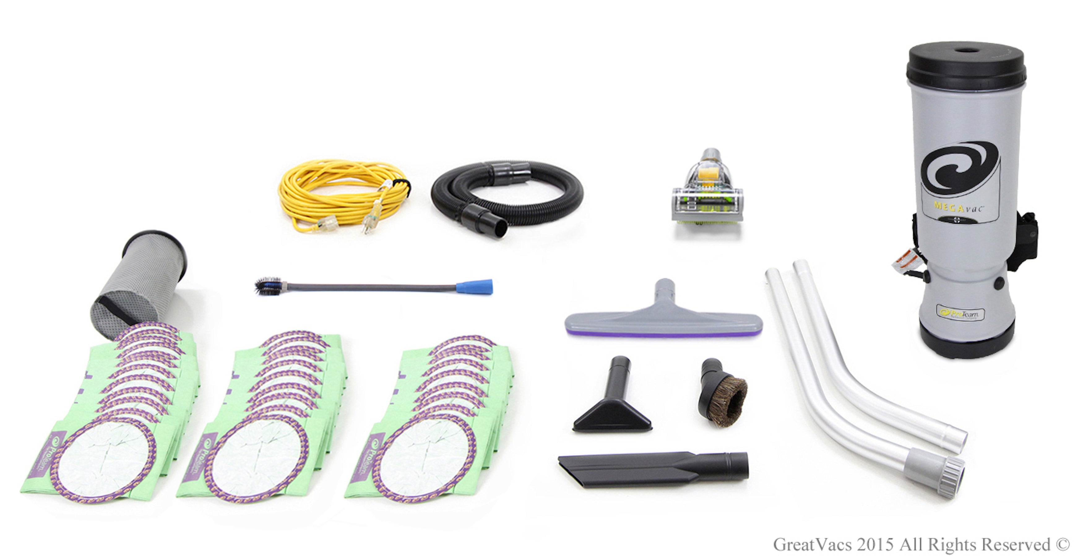 • ProTeam MegaVac Backpack Vacuum - Fully Loaded ProTeam MegaVac backpack vacuum with the GV DELUXE attachment set, which includes: 50' cord, 30 additional GV bags, GV mini turbo attachment (This works great as a pet tool for vacuuming up pet hair, vacuuming stairs and hard to reach places, mattress, upholstery, cars etc.), 2 extra GV HEPA filters, GV inflation tool, ProTeam 1 - 1/2" heavy duty Multi surface Floor tool, Duster brush, Crevice tool, Upholstery tool, 2 tool extension wands, and heavy duty tool hose.