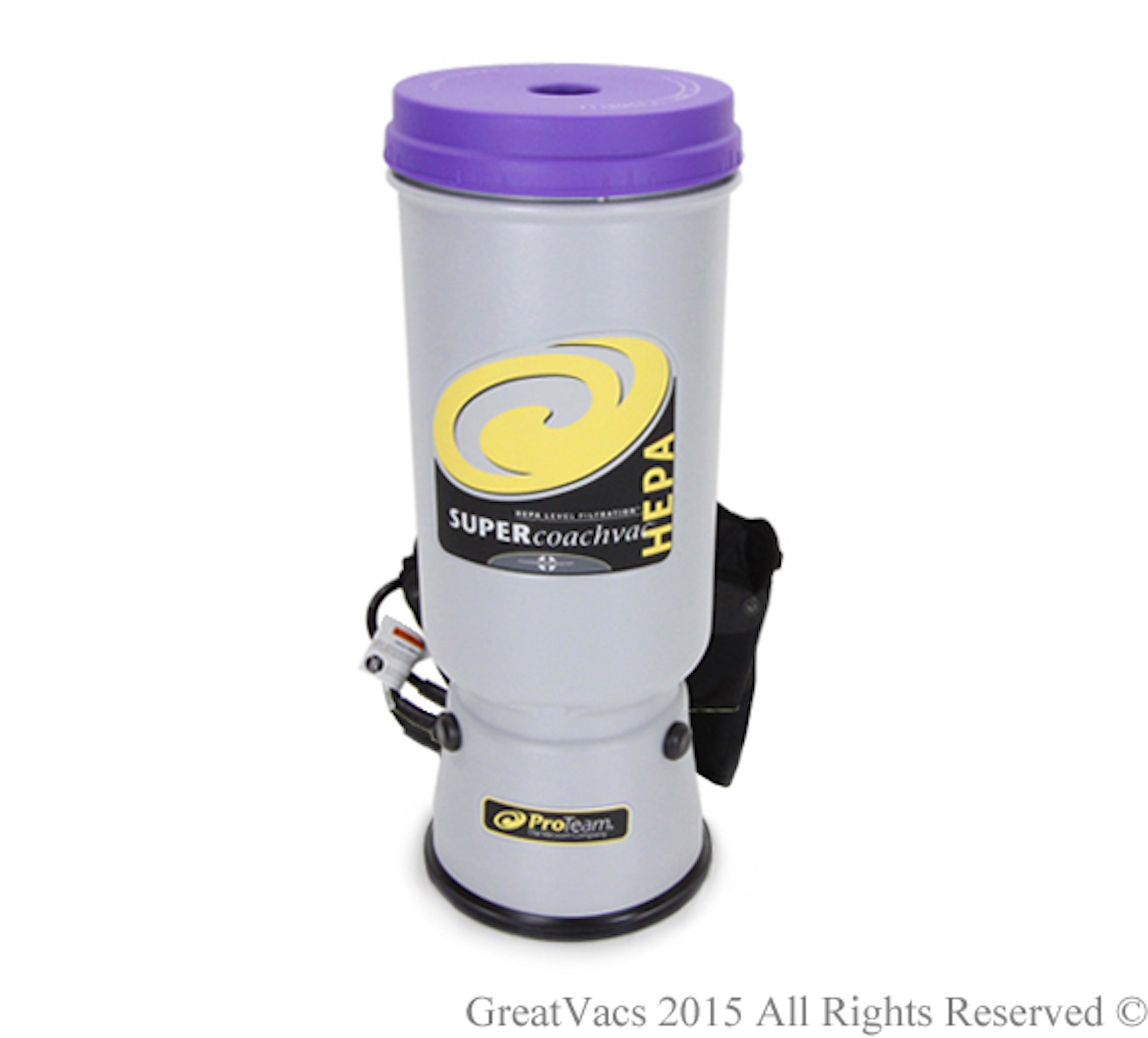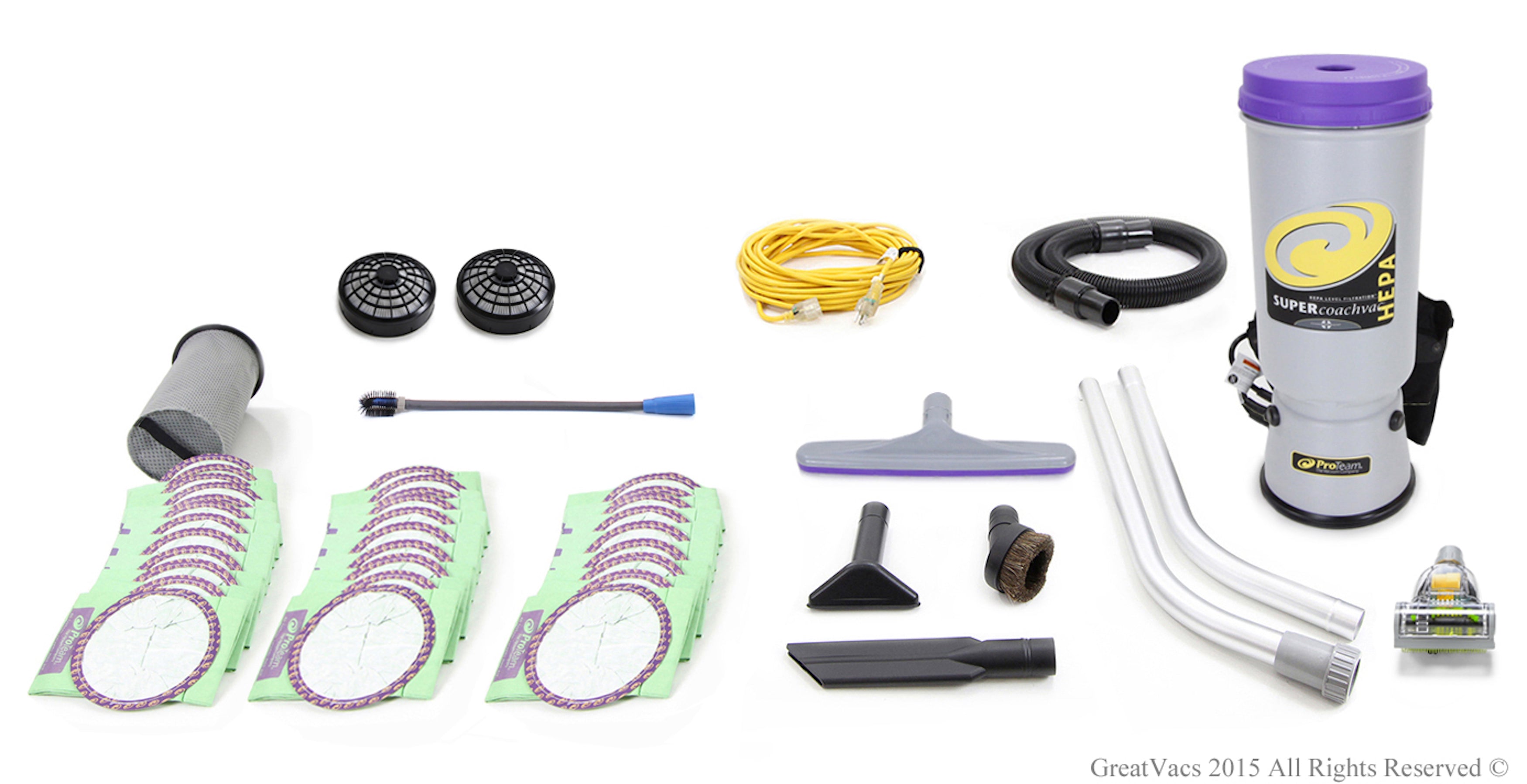 • ProTeam Super CoachVac Backpack Vacuum - Fully Loaded  ProTeam Super CoachVac backpack vacuum with the GV DELUXE attachment set, which includes: 50' cord, 30 additional GV bags, GV mini turbo attachment (This works great as a pet tool for vacuuming up pet hair, vacuuming stairs and hard to reach places, mattress, upholstery, cars etc.), 2 extra GV HEPA filters, GV inflation tool, ProTeam 1 - 1/2" heavy duty Multi surface Floor tool, Duster brush, Crevice tool, Upholstery tool, 2 tool extension wands, and heavy duty tool hose. The Super CoachVac comes with a 5 year motor warranty.