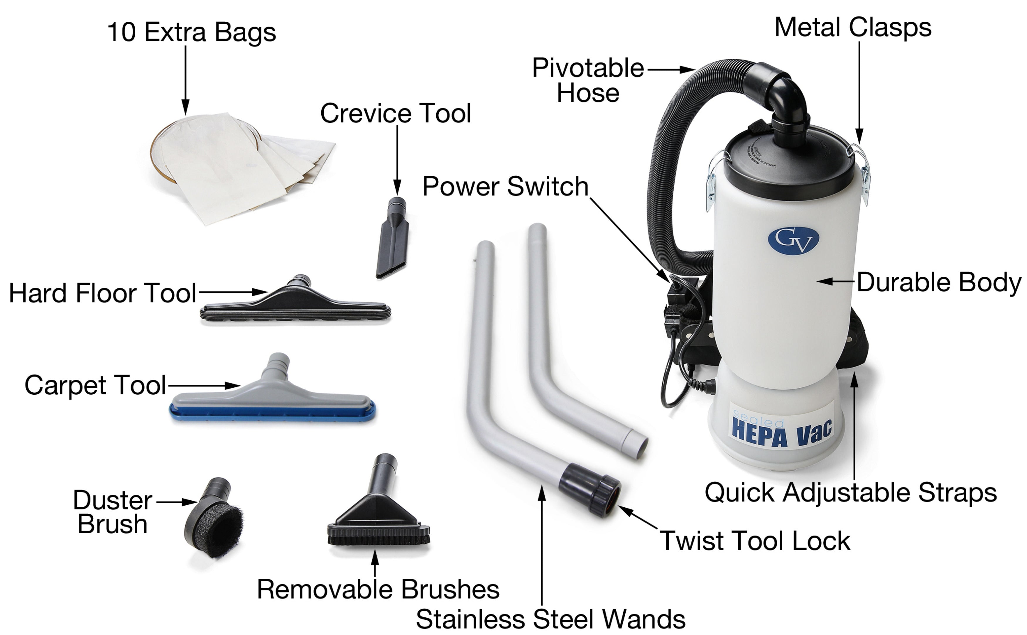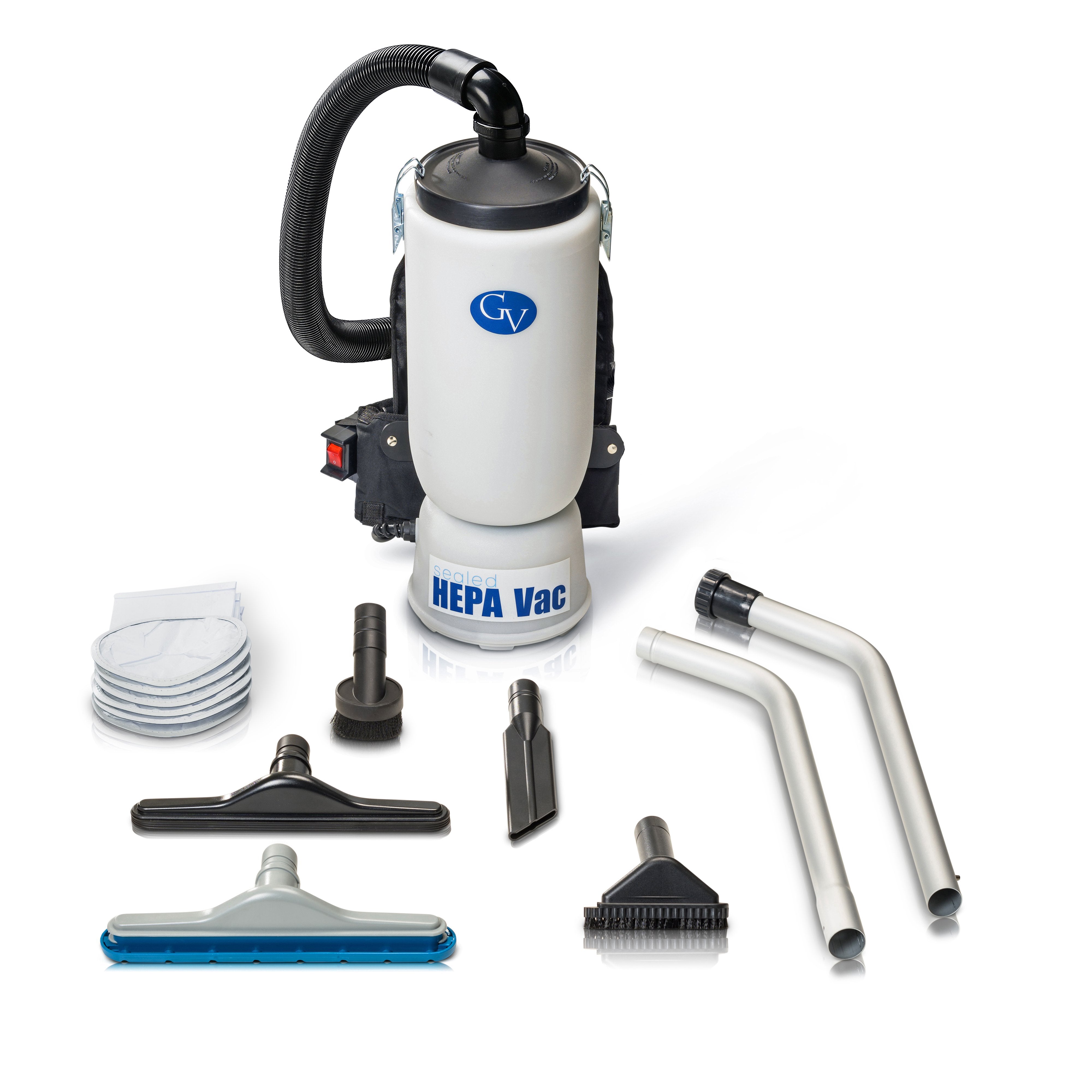 • BRAND NEW FACTORY SEALED GV 6 Quart HEPA Backpack Vacuum.   This is the GV Professional lightweight backpack vacuum with the professional 1 1/2" (larger size for the toughest jobs) tool kit.