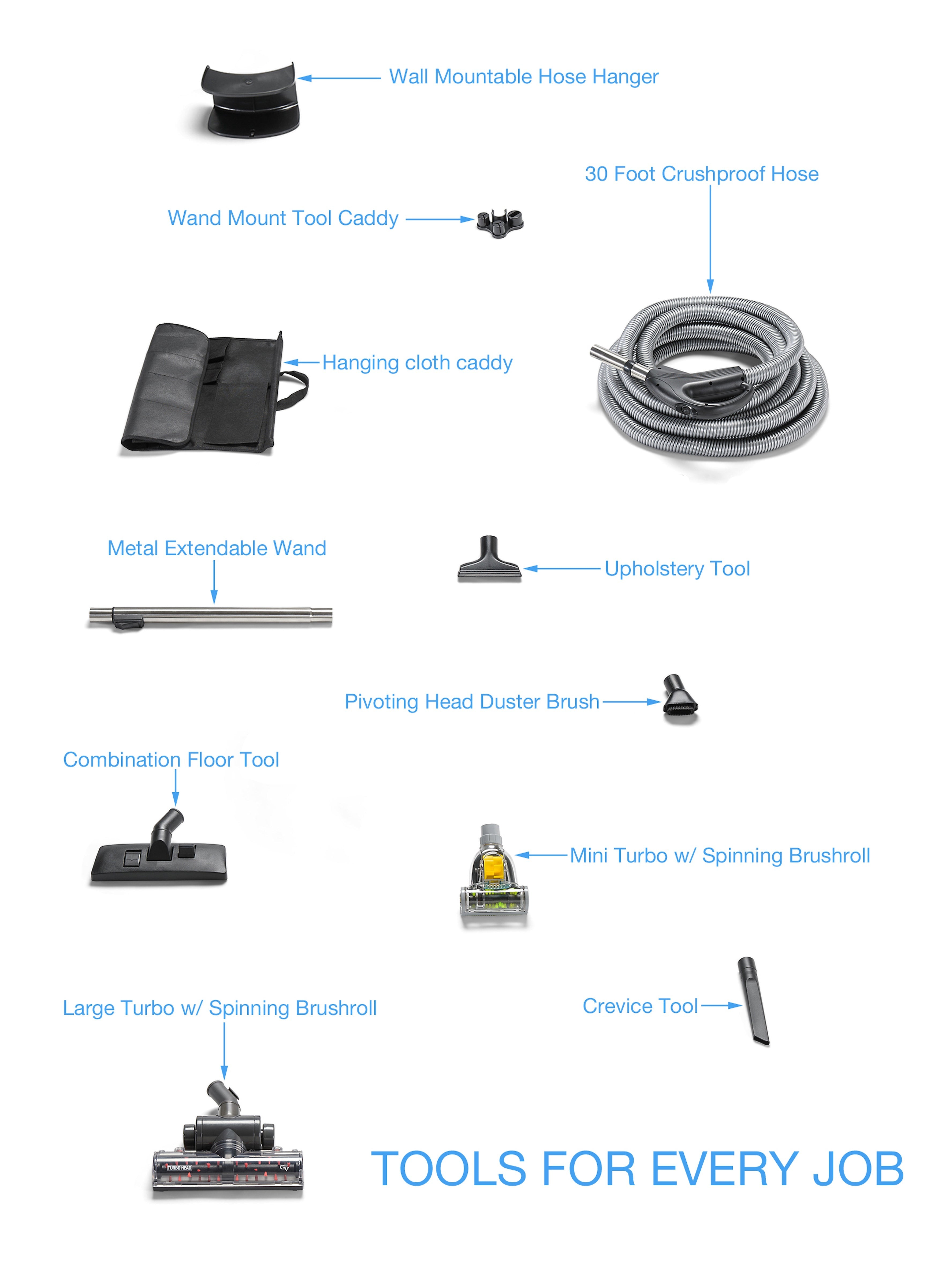 • Deluxe Tools- Includes the floor tool ( switch between hard floor surfaces and throw rugs), crevice tool, upholstery tool (with slide off brushes), Large turbo nozzle (perfect for any floor surface), mini turbo (for pet hair and upholstery), extendable wand, tool caddy and duster tool. Also comes with a large tool caddy for all your tools and a hose hanger.